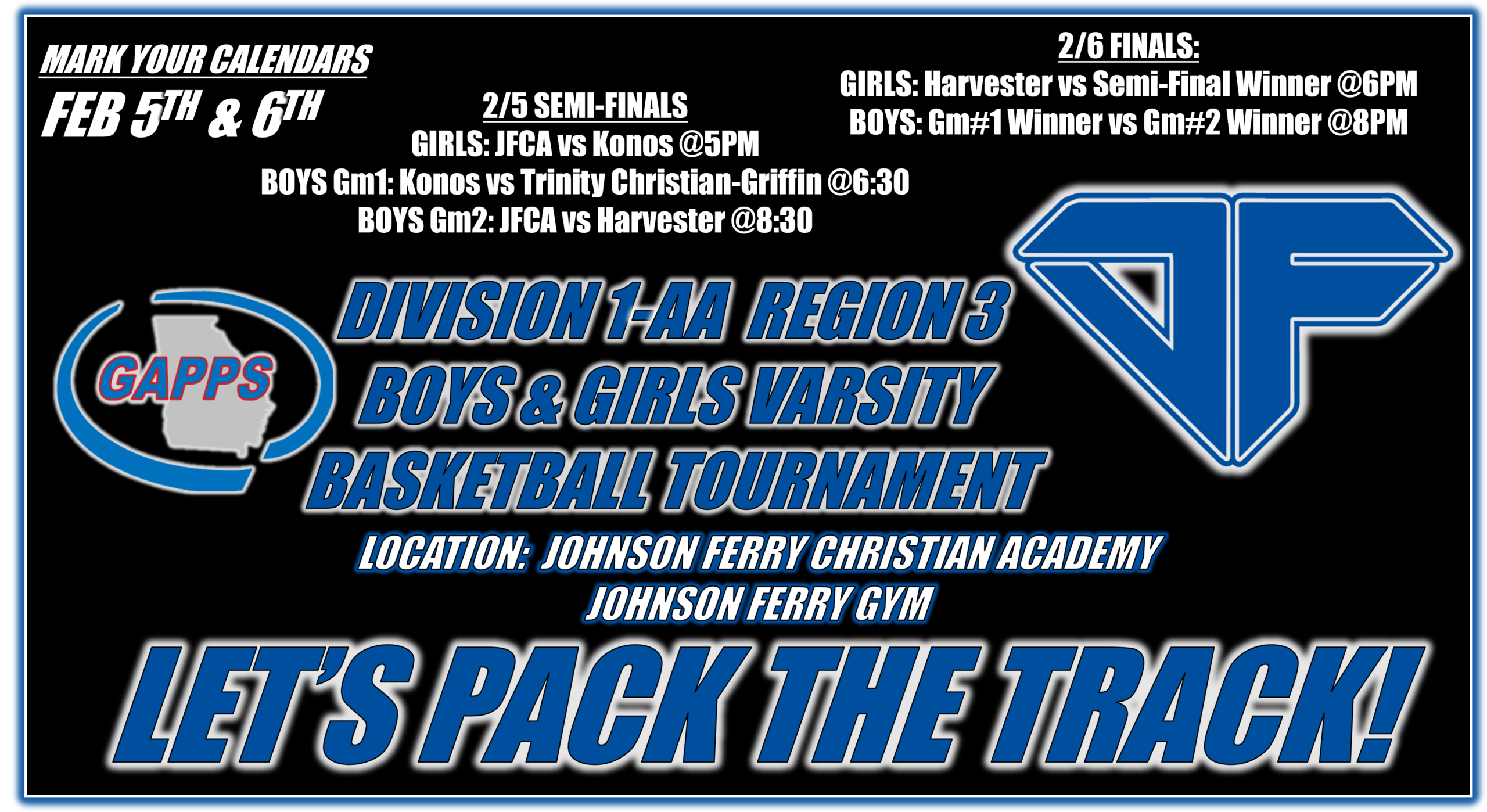 LET’S PACK THE TRACK! SAINTS BASKETBALL IN THE POST SEASON! The 2026 GAPPS Region Tournament is here and we are hosting! Join us Thursday, Feb 5th, as our Saints Varsity Basketball Teams begin their quest for Region Championships. Varsity Girls take on Konos Academy at 5pm and then at 8:30pm, our Top Seeded Varsity Boys will battle Harvester. The 6:30 game features Konos vs Trinity Christian of Griffin. The winners of Thursday’s games will face off Friday for the Region Championship. The girls play at 6pm and the boys at 8pm. Let’s Pack the Track and Bring the Noise! Go Saints!